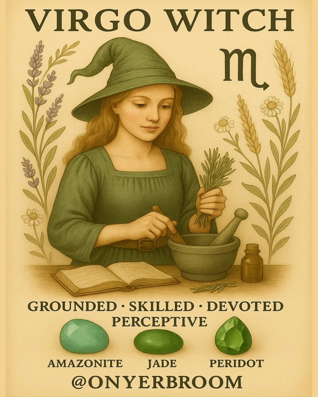 Illustration of a young woman in a green dress and a witch hat, grinding herbs in a mortar and pestle, with an open book, a small bottle, and herbs on the table. The background features plants with text describing Virgo witch traits and gemstones: Amazonite, Jade, Peridot.