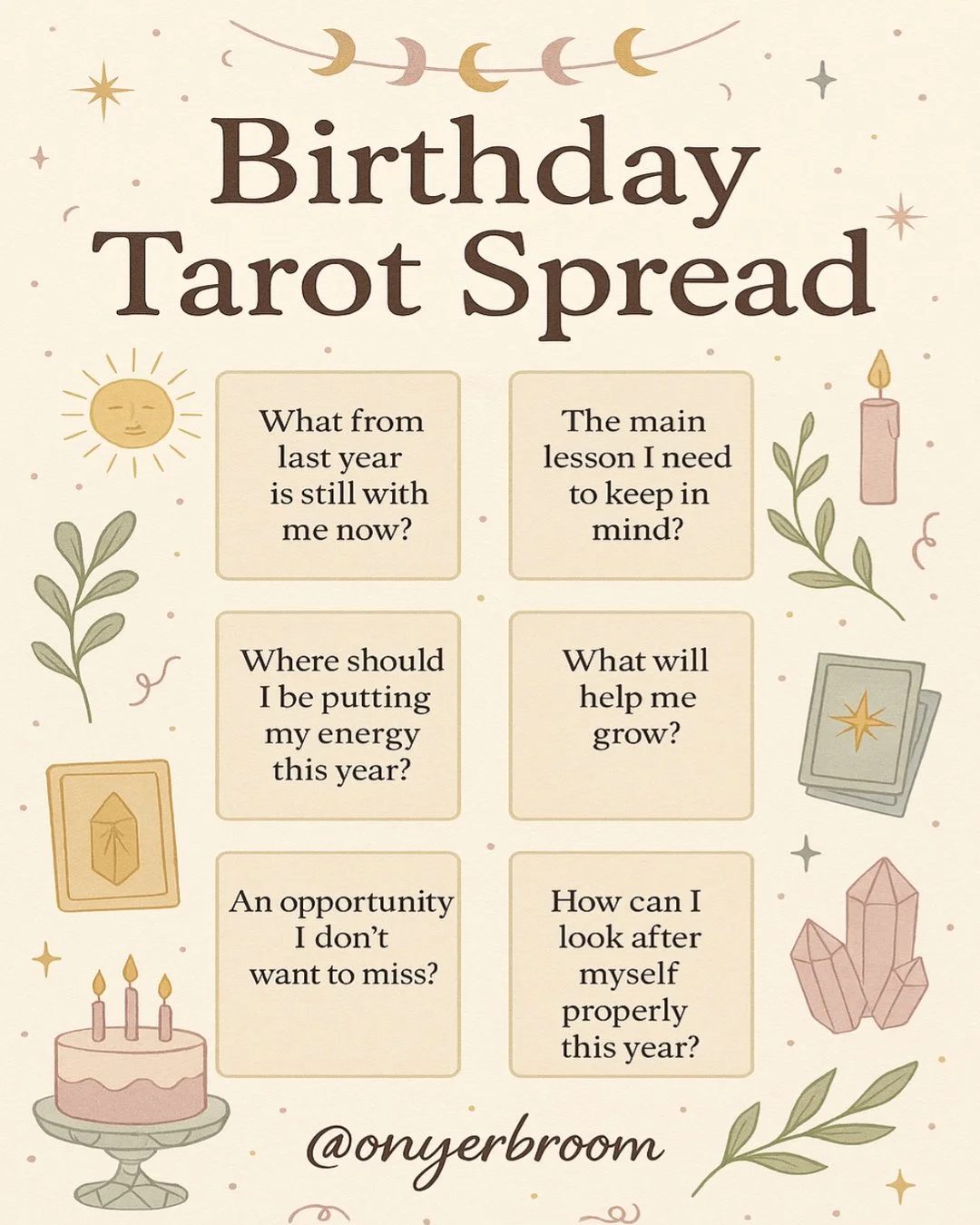 A pastel-colored graphic with the title 'Birthday Tarot Spread' and six questions related to birthday reflections. Decorative elements include a crescent moon and stars, a sun, candles, crystals, cards, and leaves.